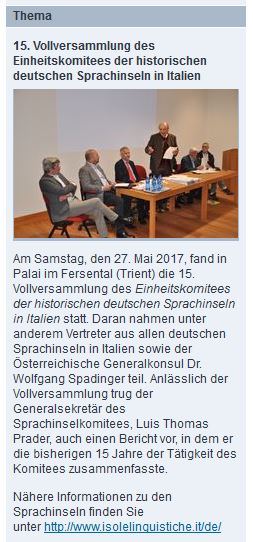 Auf der Seite: https://www.bmeia.gv.at/botschaft/gk-mailand.html findet sich unter "Aktuelles" ein Hinweis zur 15. Jahresvollversammlung des Einheitskomitees in Italien, an welcher der Österreichische Generalkonsul Dr. Wolfgang Spadinger teilgenommen hat