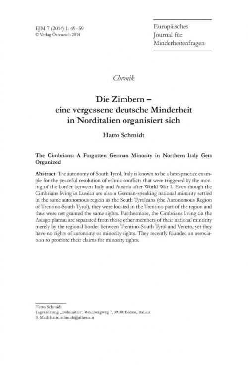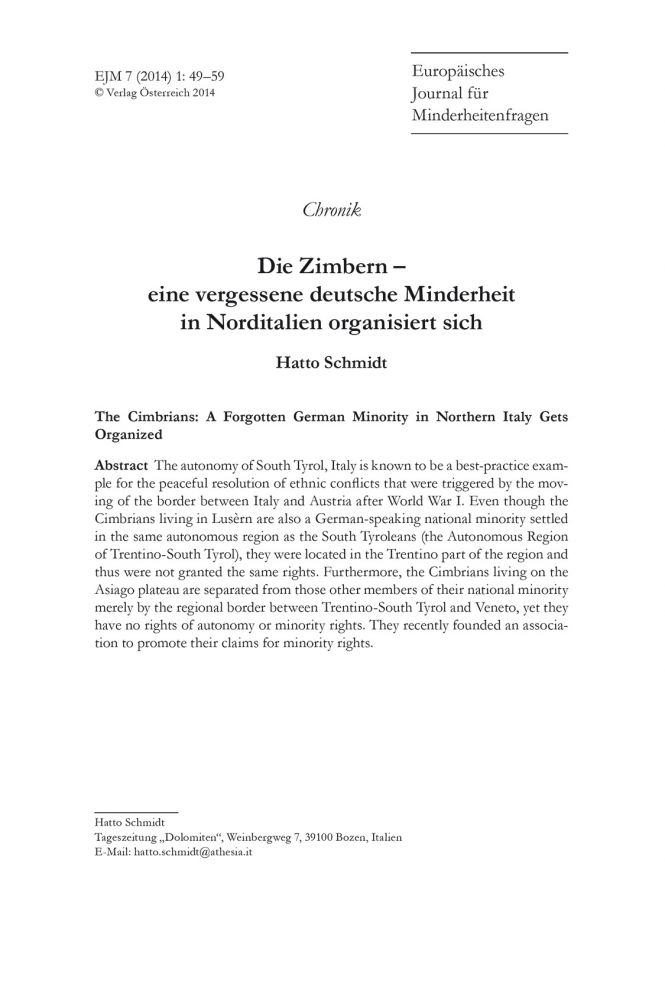 Die Zimbern - eine vergessene deutsche Minderheit organisiert sich - Beitrag von Hatto Schmidt im „Europäischen Journal für Minderheitenfragen“ Vol.7 No.1 2014