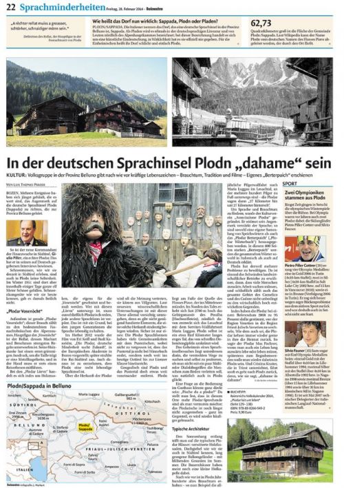 In der deutschen Sprachinsel Plodn "dahame" sein - Beitrag von Luis Thomas Prader in "Dolomiten" vom 28.04.14