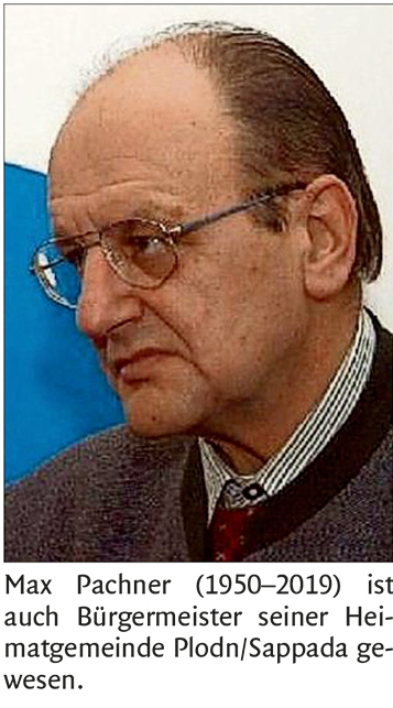 Max lasciò una profonda impronta con il suo impegno per le isole linguistiche tedesche. Ricordo ancora molto bene il nostro primo incontro: Nel maggio del 2001 si riunirono a Egna numerosi rappresentanti di isole linguistiche, per discutere del futuro delle comunità minoritarie. In quell’occasione mi si presentò un quarantenne di bella presenza, vestito con abiti tirolesi e mi disse: “I pin der Max Pachner va Plodn!” (Io sono il Max Pachner da Plodn). Assieme parlavamo sempre il Plodarisch, dialetto dell’alta Val Pusteria. Non solo: le nostre telefonate iniziavano sempre con le parole “Gelopsis Chrischtis – in èabichkait” (Sia benedetto Cristo, in eterno).